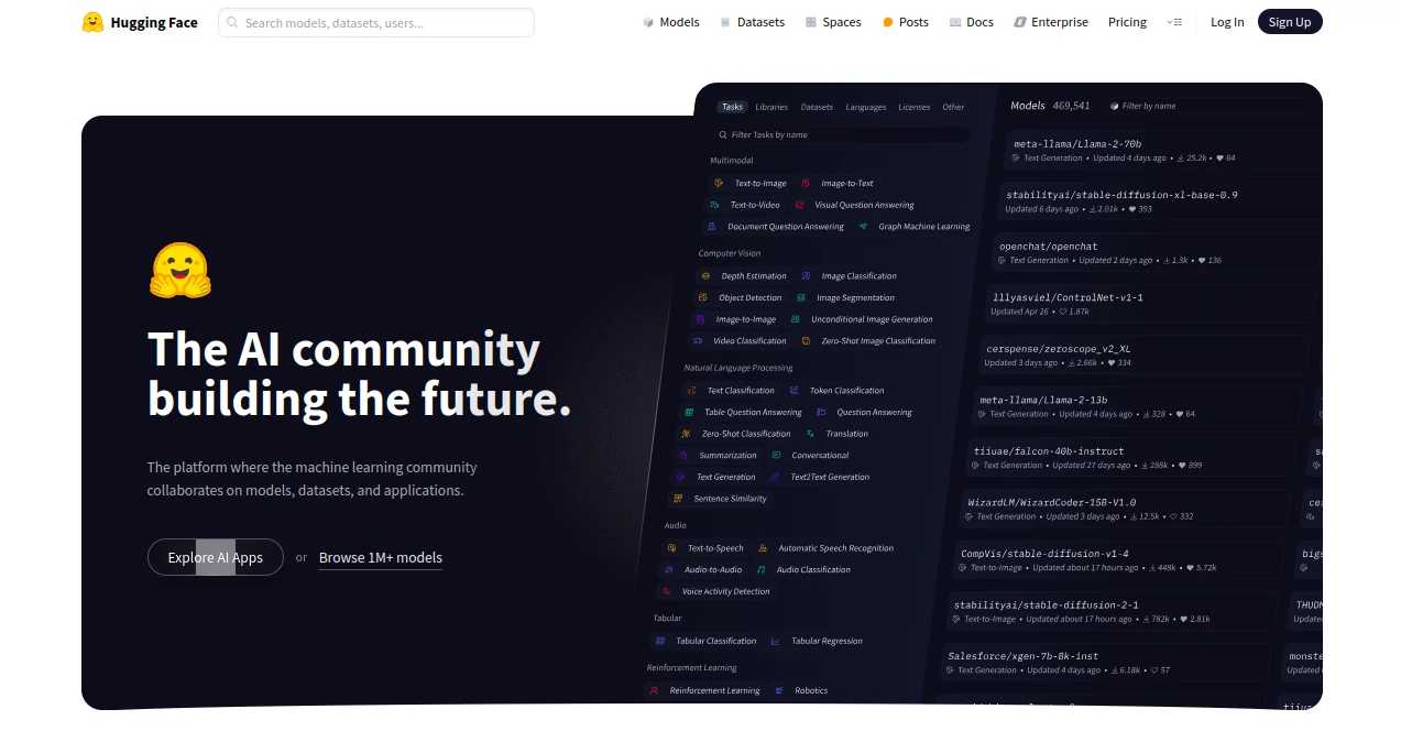 Users can explore models for text generation, translation, classification, computer vision, audio processing, and more within one central hub.