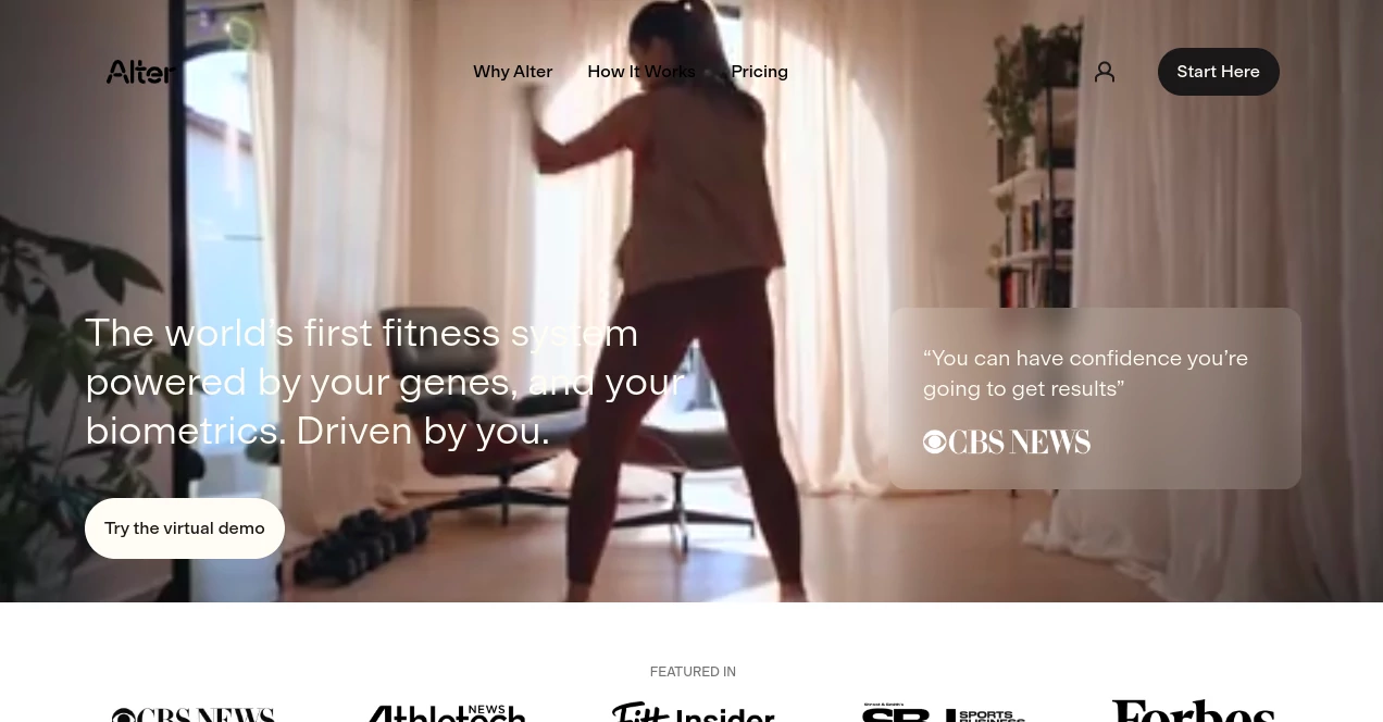 AlterMe is a personalized health and fitness platform that combines genetic testing, biometric tracking, and customized workout and nutrition plans. It uses DNA analysis and daily data from wearable devices to build a fitness program tailored to each user.