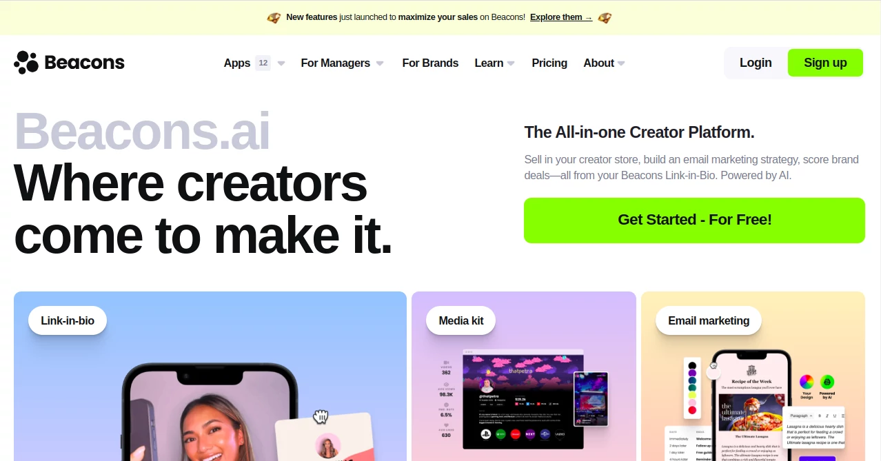 Beacons AI is an all in one link in bio and personal page platform that helps creators share multiple links and content from a single landing page. It is used to centralize social profiles, videos, audio, shops, and other online content.
