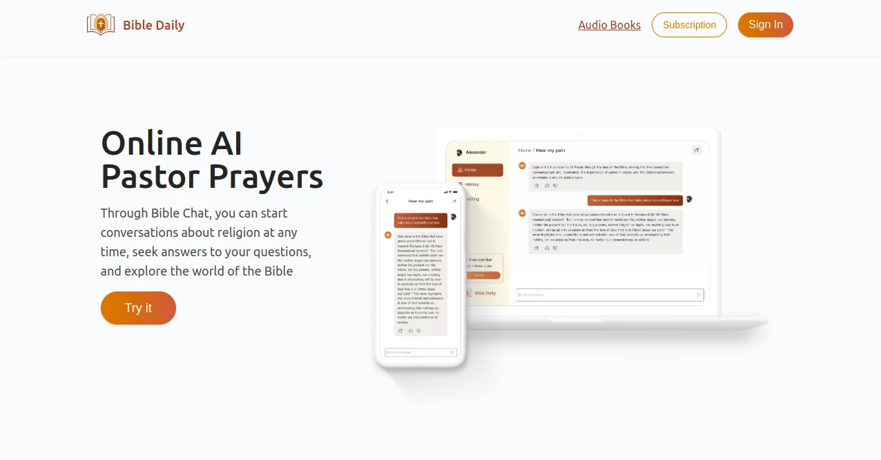 Bibles Chat is an AI powered Bible assistant and scripture study tool that helps users explore the Bible and get answers to questions about scripture in a conversational format. The platform uses artificial intelligence to provide responses based on biblical text and principles.