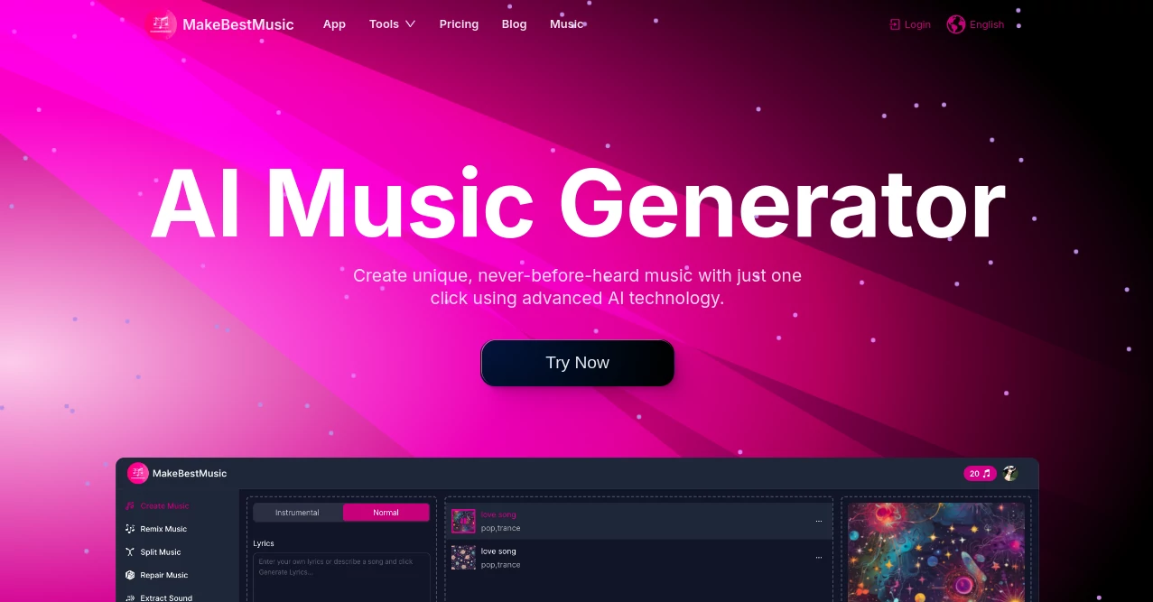 MakeBestMusic is an AI powered music creation platform that lets users generate original songs and soundtracks using artificial intelligence. The tool enables music creation from simple text descriptions or lyrics without requiring music production skills.
