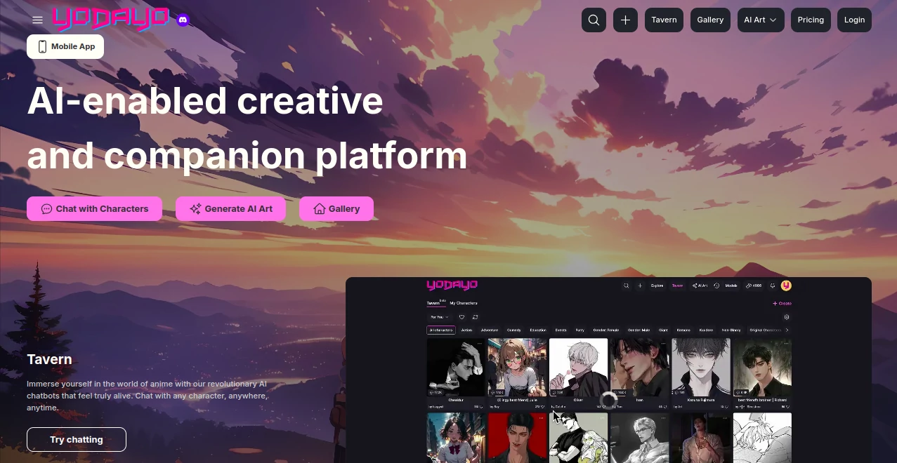 The service includes an interactive chat feature called Tavern where users can converse with AI driven anime characters and explore stories and role playing.